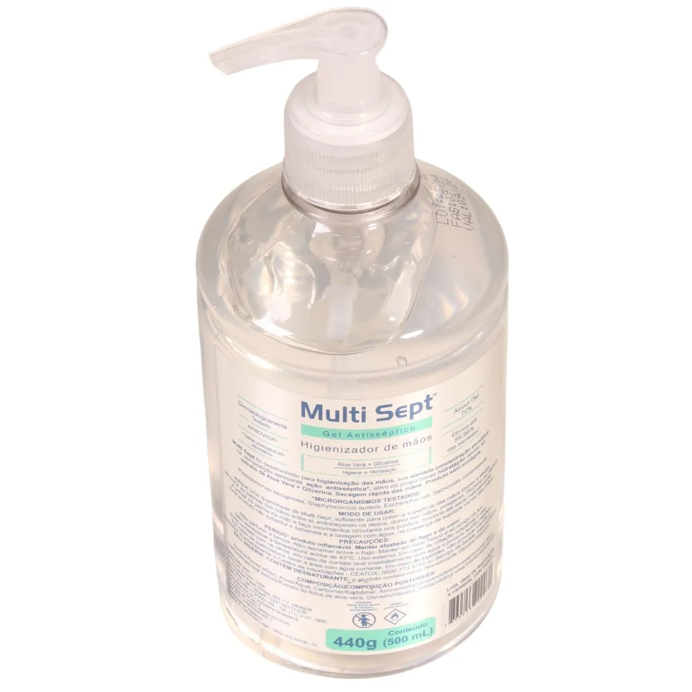 Multisept - Gel Antisséptico é um gel a base de álcool desodorizado para higienizar as mãos, ideal como suplemento às lavagens rotineiras com água e sabão. Evapora rapidamente sem deixar odor residual. A elevada concentração alcóolica na sua composição proporciona uma excelente ação anti-séptica, além de proporcionar hidratação pela ação da aloe vera.
