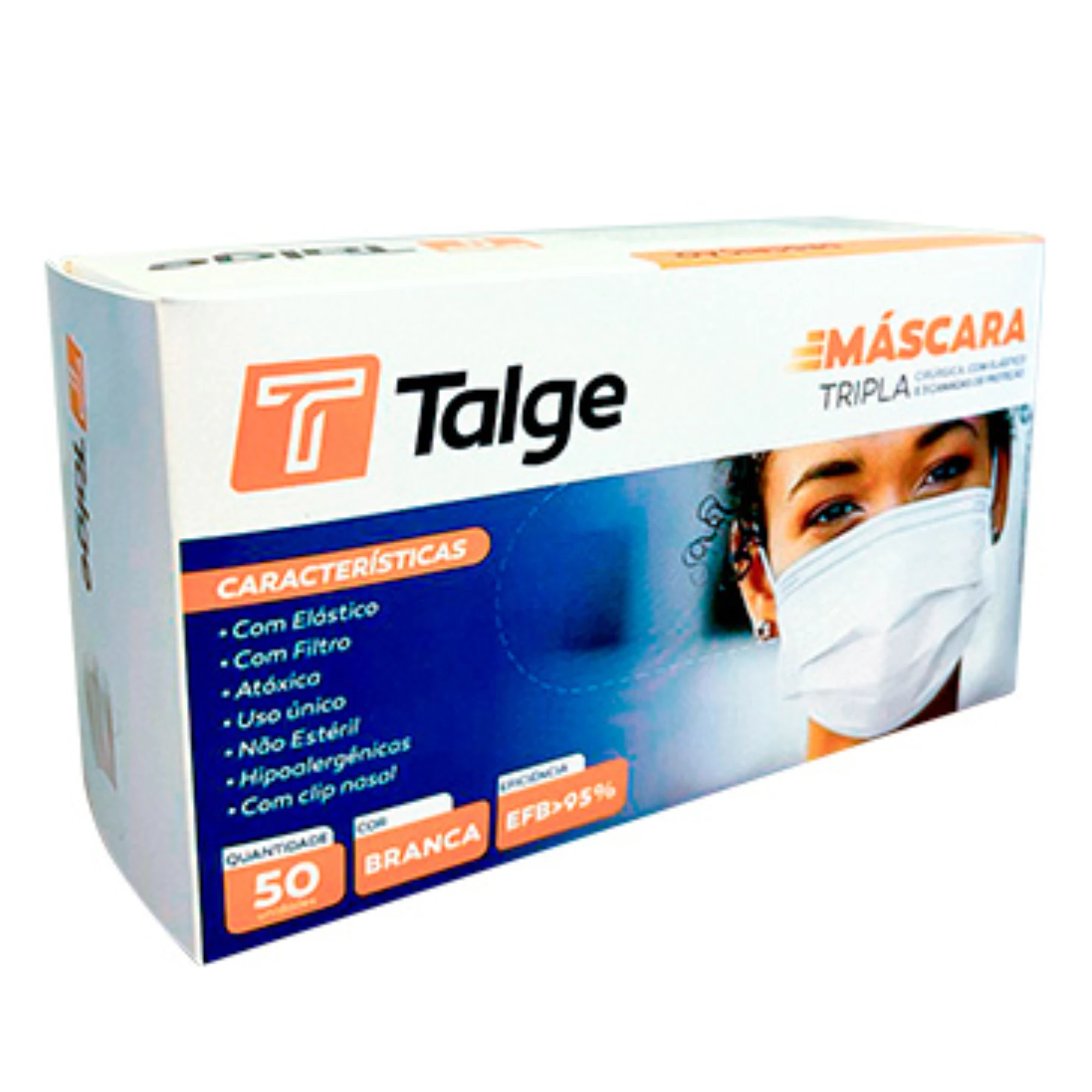 Máscara Cirúrgica Tripla Camada, Descartável TNT com Elástico e Clip Nasal cor Branca Cx/50 - Talge | Castro Naves