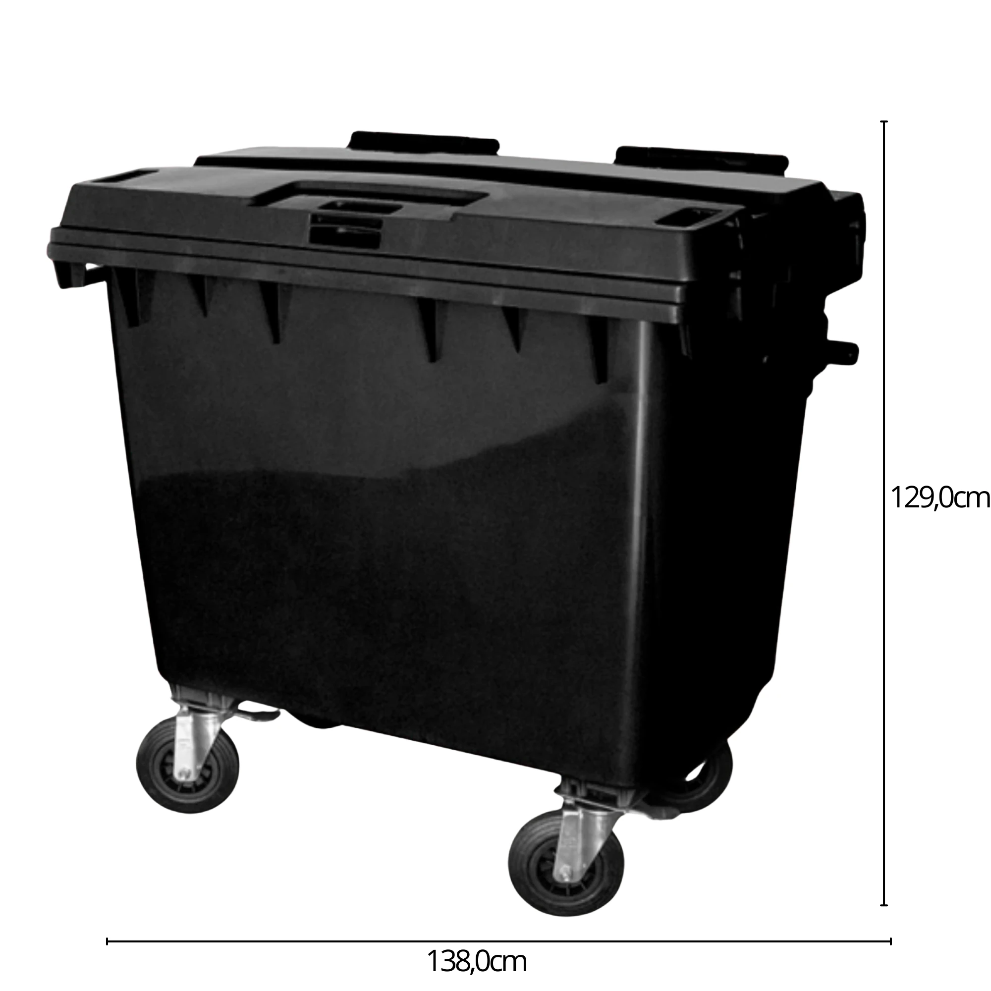 É resistente ás intempéries, a solução ácidas e alcalinas. Acompanha tampa articulada ao próprio corpo, munhões laterais para basculamento na cor preta, dreno inferior incorporado ao corpo para escoamento de líquidos e quatro rodas giratórias de borracha maciça de 8" (200 mm) com carga de aço galvanizado, sendo duas fixas e duas com freio de estacionamento e ângulo de giro de 360º. Este produto é fabricado em conformidade com a Norma DIN EN 840.