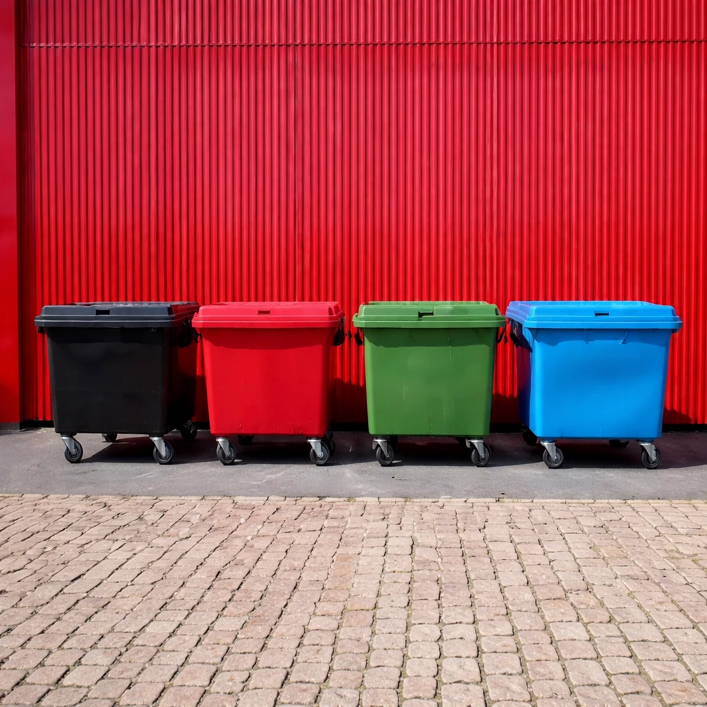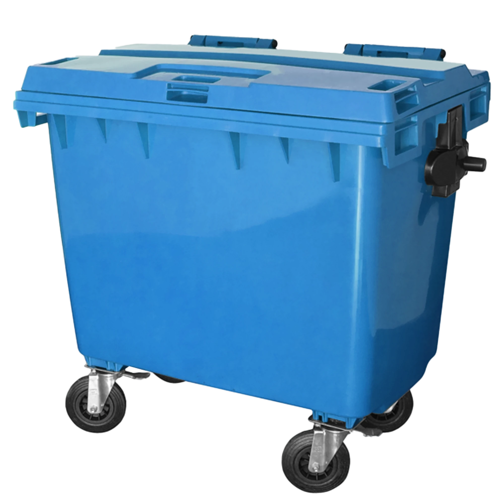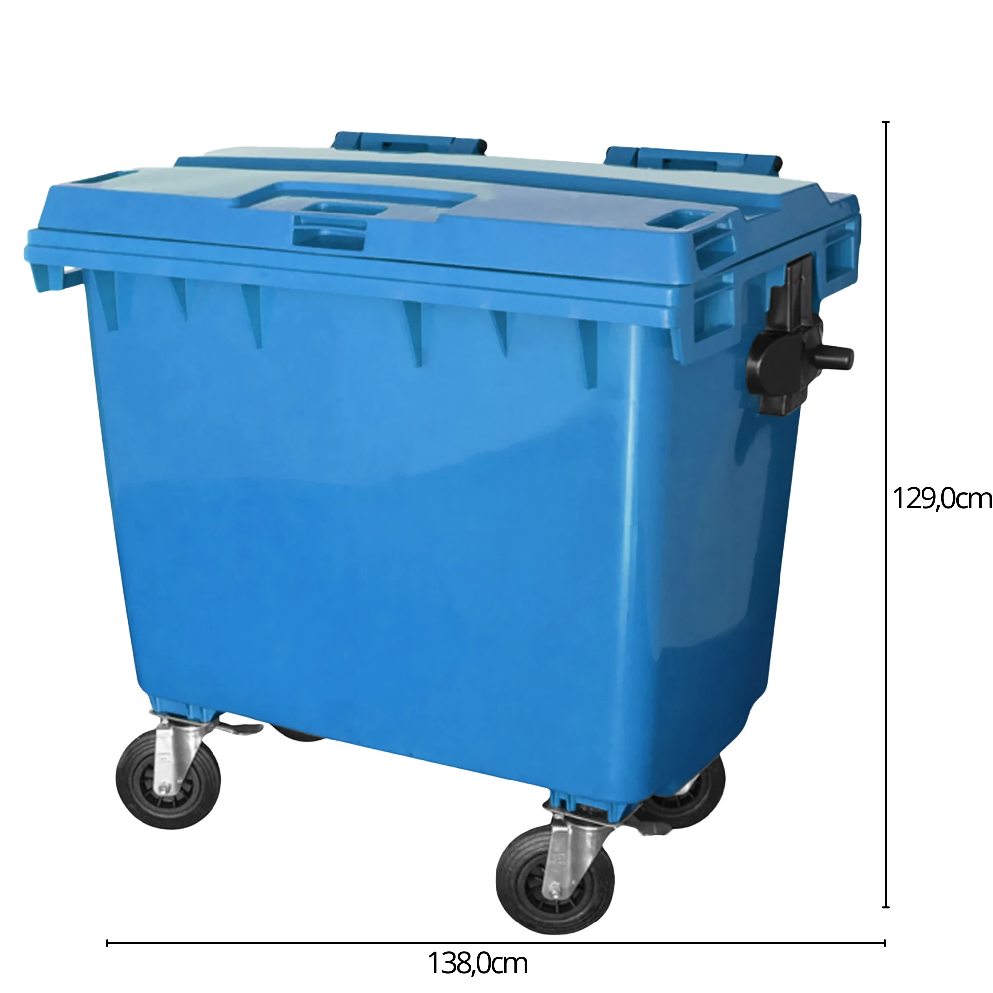 É resistente ás intempéries, a solução ácidas e alcalinas. Acompanha tampa articulada ao próprio corpo, munhões laterais para basculamento na cor preta, dreno inferior incorporado ao corpo para escoamento de líquidos e quatro rodas giratórias de borracha maciça de 8" (200 mm) com carga de aço galvanizado, sendo duas fixas e duas com freio de estacionamento e ângulo de giro de 360º. Este produto é fabricado em conformidade com a Norma DIN EN 840.