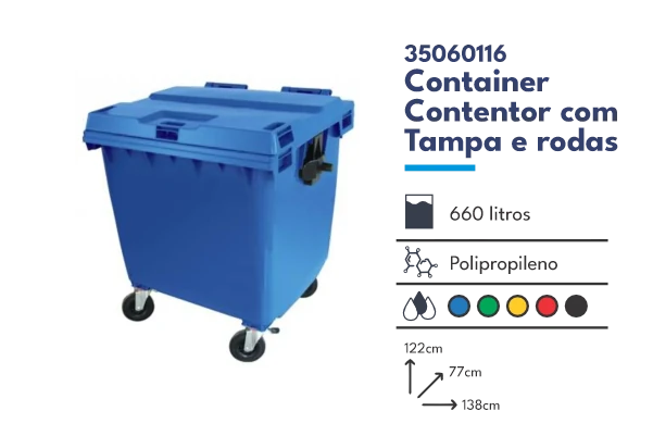 Contêiner injetado em plástico polietileno de alta densidade (PEAD) 100% virgem e aditivado com proteção UV para evitar o desbotamento da cor sob efeito dos raios solares. Sua superfície é lavável e impermeável, de forma a não permitir o vazamento de líquidos e seus cantos internos são arredondados.