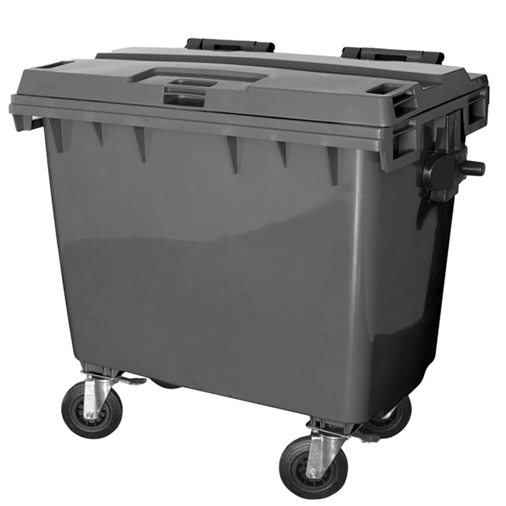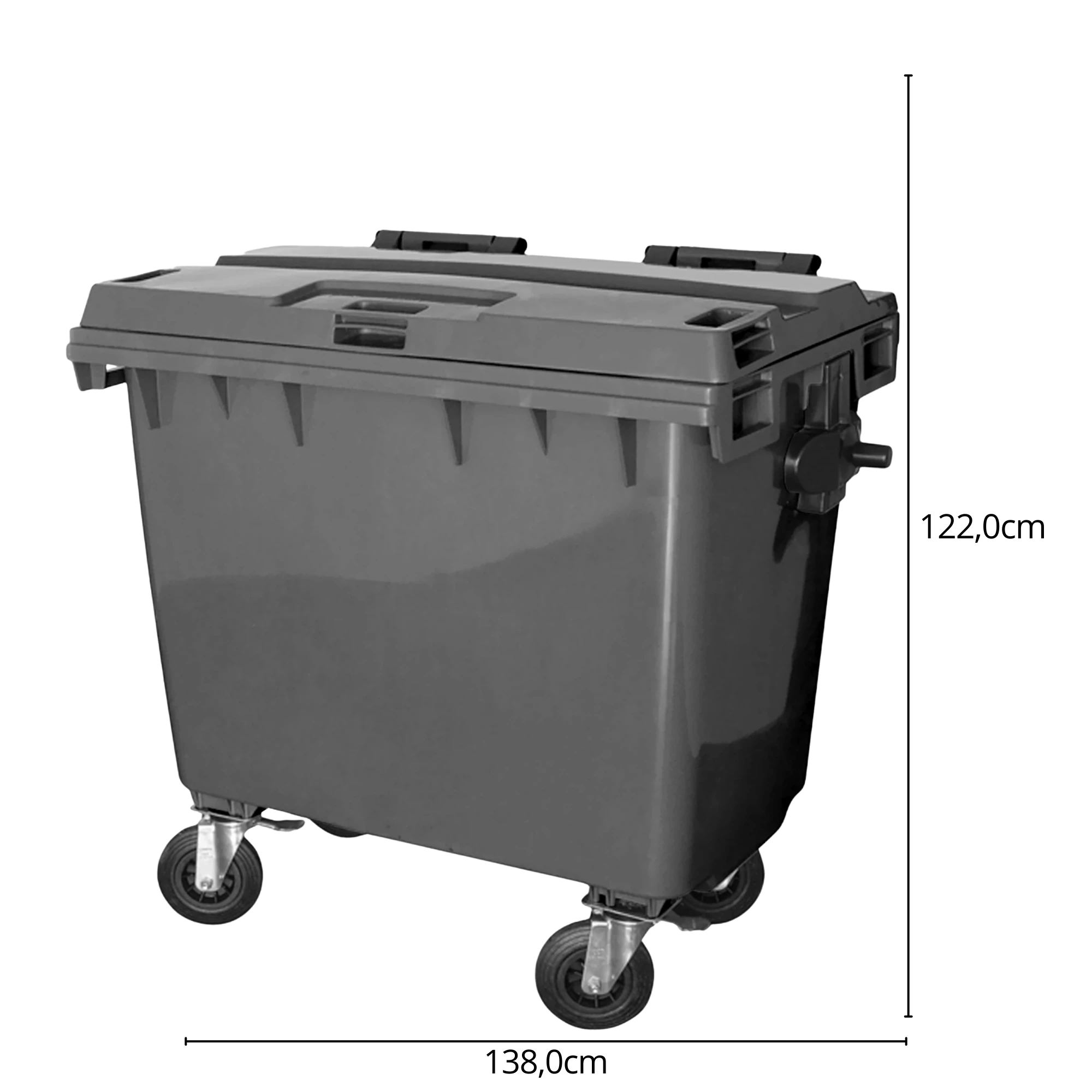 - Acompanha tampa articulada ao próprio corpo, munhões laterais para basculamento na cor preta, dreno inferior incorporado ao corpo para escoamento de líquidos e quatro rodas de borracha maciça de 200 mm com carga de aço galvanizado, sendo duas fixas e duas com freio de estacionamento e ângulo de giro de 360º.