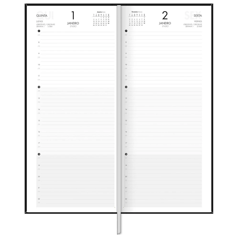 -Capa: com material especial e dura -Capa acabamento: com detalhe metalizado -Fitilho -Produto certificado: FSC -Visão: diária -Formato: 123mm x 275mm -Gramatura: 63 g/m² -Número de folhas: 208 folhas