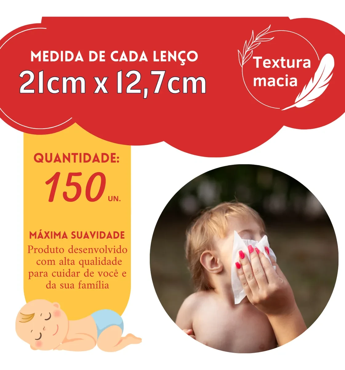 • Contém 150 lenços duplos de 21,2cm x 12,7cm cada.