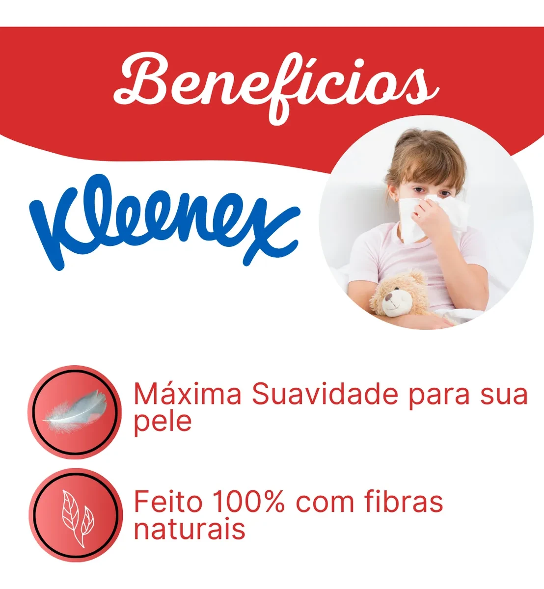 Kleenex é um lenço de papel com folha dupla, suave e resistente, produzido com 100% de fibras naturais. Seu uso não agride a pele e evita irritações e vermelhidões causadas pelo uso excessivo de lenços, principalmente em períodos de gripe e resfriado.